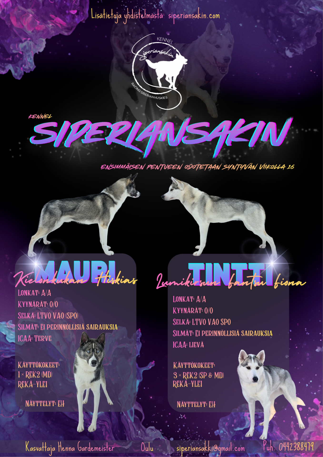 Mikäli pentue kiinnostaa, tutustu Pentu meiltä? -osioon ja ota yhteyttä Instagramissa @siperiansakki, sähköpostilla tai laita WhatsApp-viestiä. Esittelethän itsesi jo ensimmäisessä viestissä.